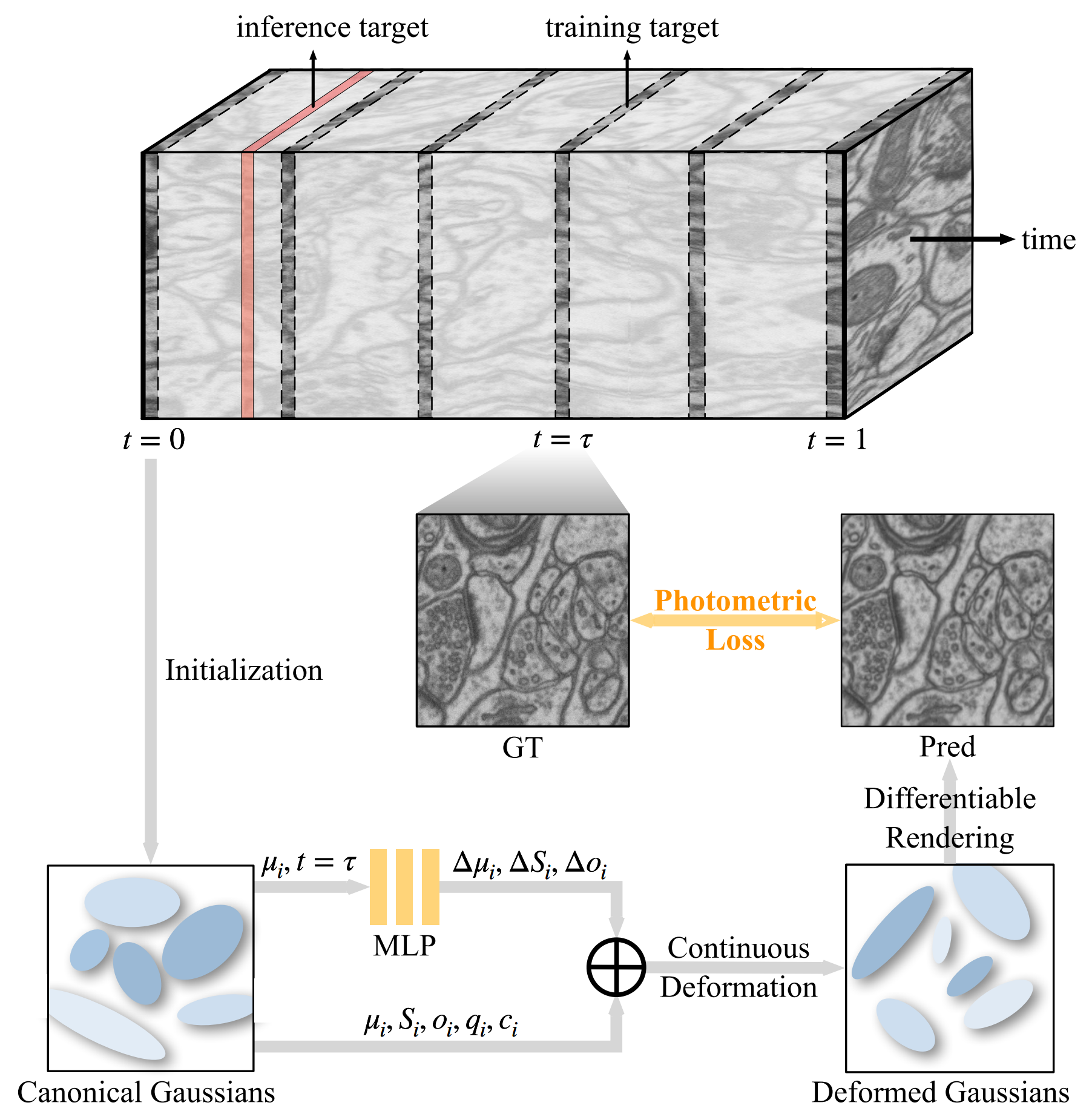 We interpret the low-resolution z-axis as a temporal dimension and employ a deformable 2D Gaussian splatting representation to model thegeometric evolution of 2D structures along depth.